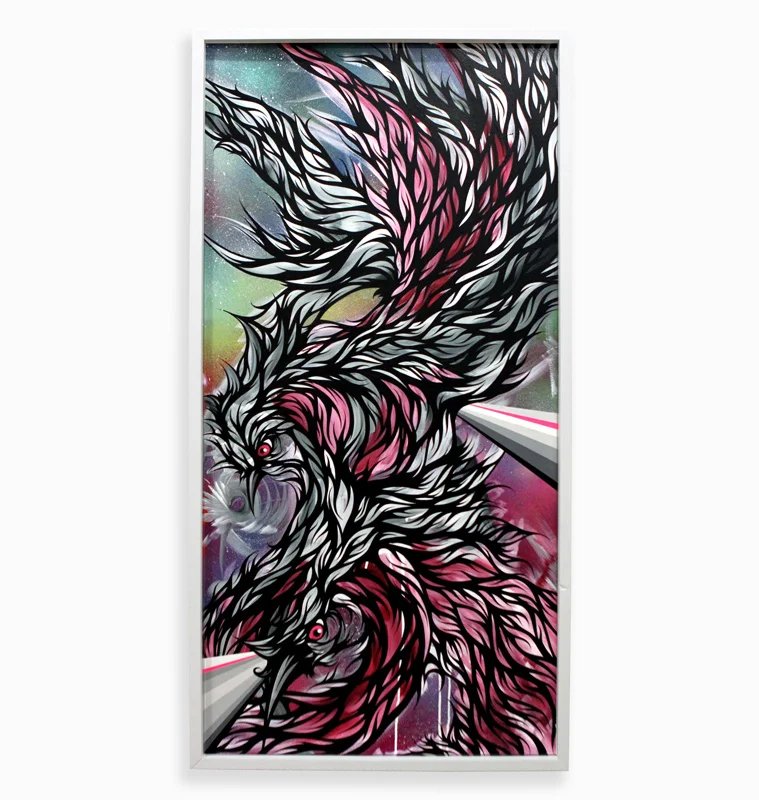 "With each process I always work from a basic concept or idea but I truly enjoy the path of the unknown, working without restrictions. I start with the idea and or a basic sketch, then I lay down a background. From there I go on the venture the brush or the can of spray takes me." - Malt.