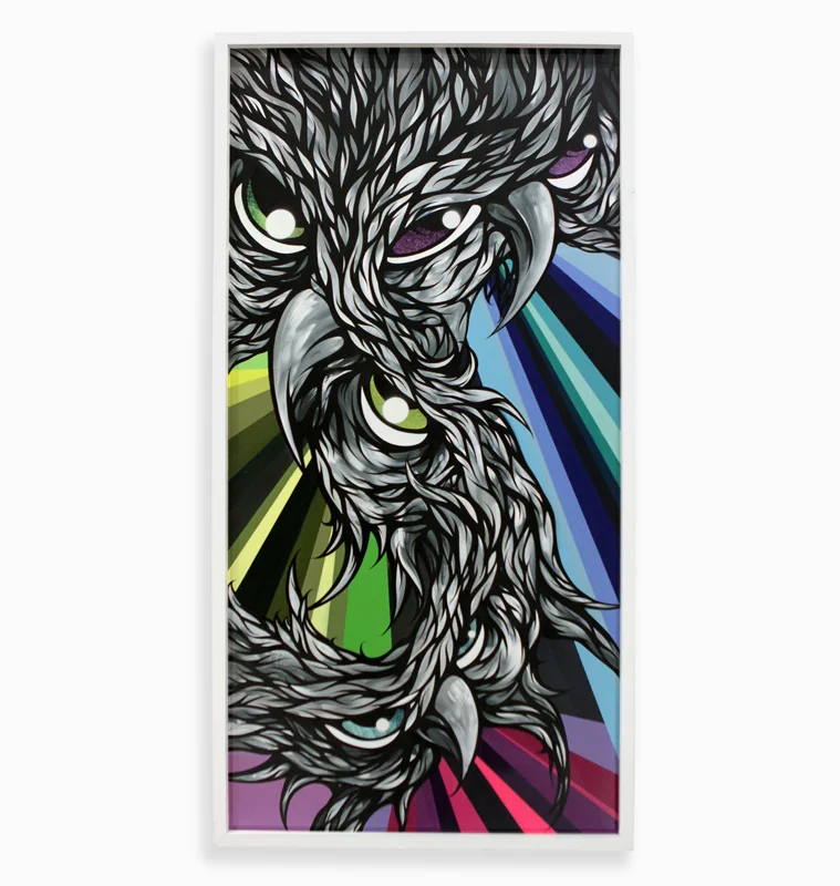 With his recent studio work Malt strives to bridge the gap from his engaging public murals to concise studio explorations, sometimes breaking his signature owls down to their most abstract.