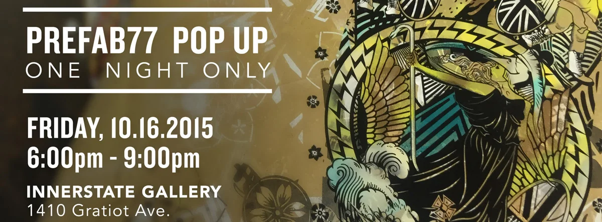 United Kingdom artist collective Prefab77 have descended on Detroit’s Inner State Gallery for a 2-week residency and pop-up exhibition opening on October 16th from 6-9pm.