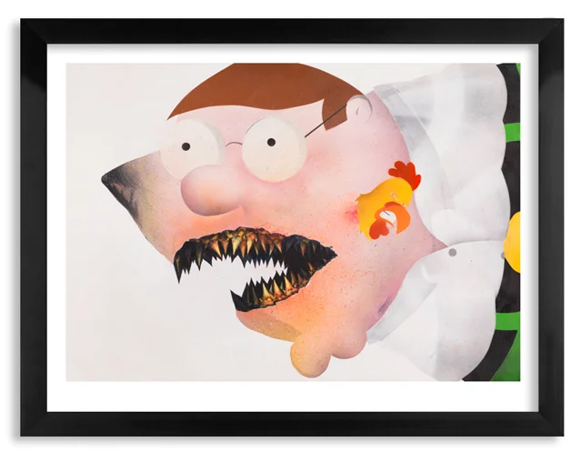 His ever evolving cache of work includes Guilty Pleasures, a series of iconographic cigarette packs and slot machines, the pulp-comic inspired Mayday series of idealized romance, and pop culture caricature shark heads featured in his most recent solo show, I'm Shark Toof, Who The Hell Are You? at Innerstate Gallery. Symbiotically, with attention to juxtaposition of shapes, line quality, composition, and tension of content, Shark Toof’s fine art paintings become an intimate look onto ourselves, questioning our belief systems of romance and nature.